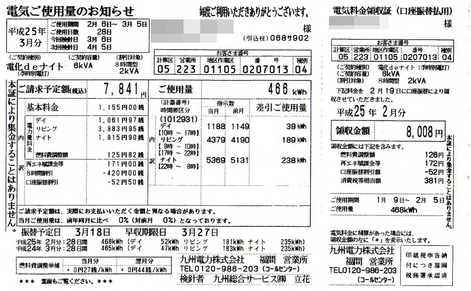 左の伝票が通常各家庭に送られてくる「電気ご使用量のお知らせ」です。